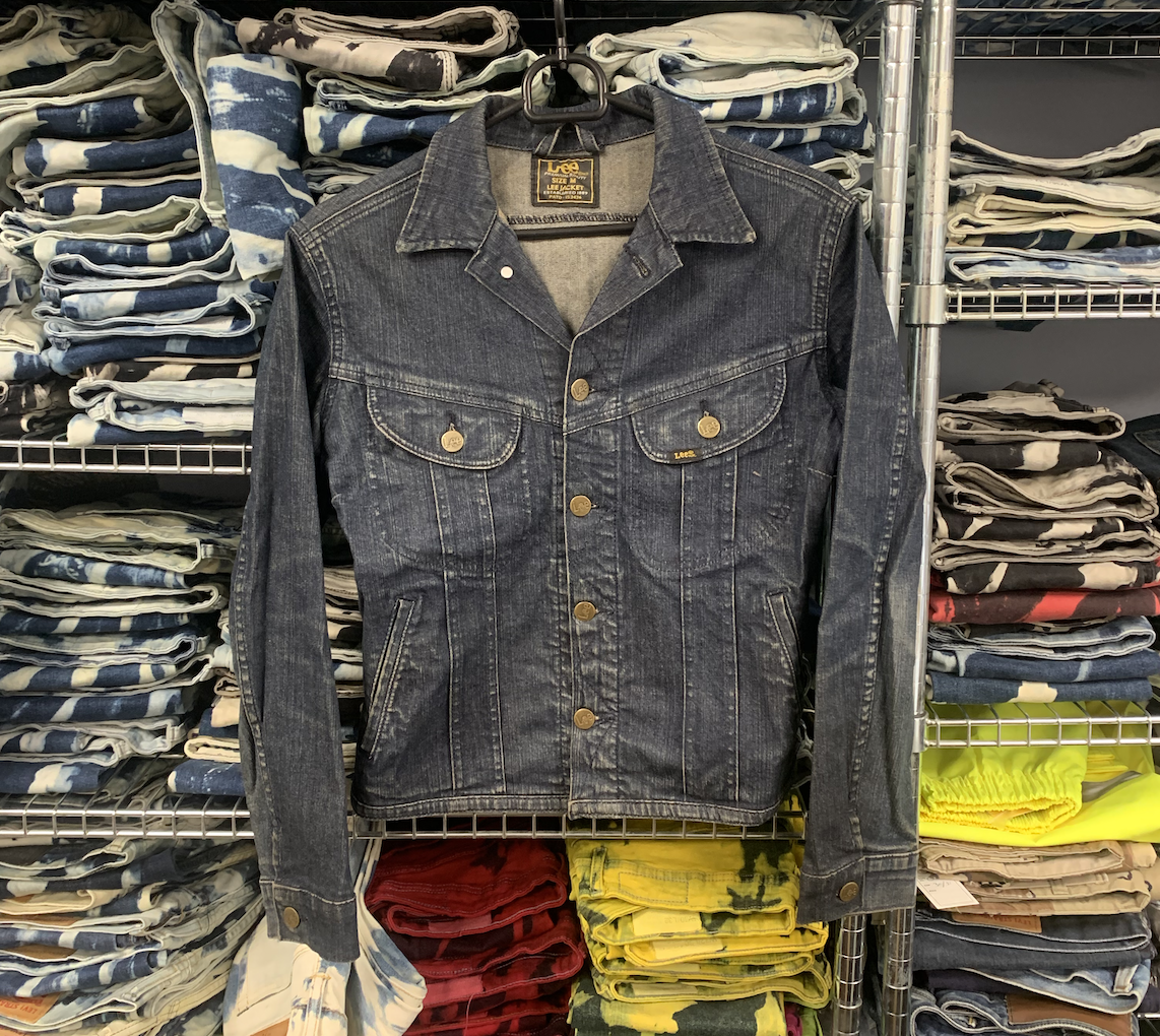 Il s'agit d'une veste Lee récupérée originale en denim bleu. Il s'agit d'une coupe slim