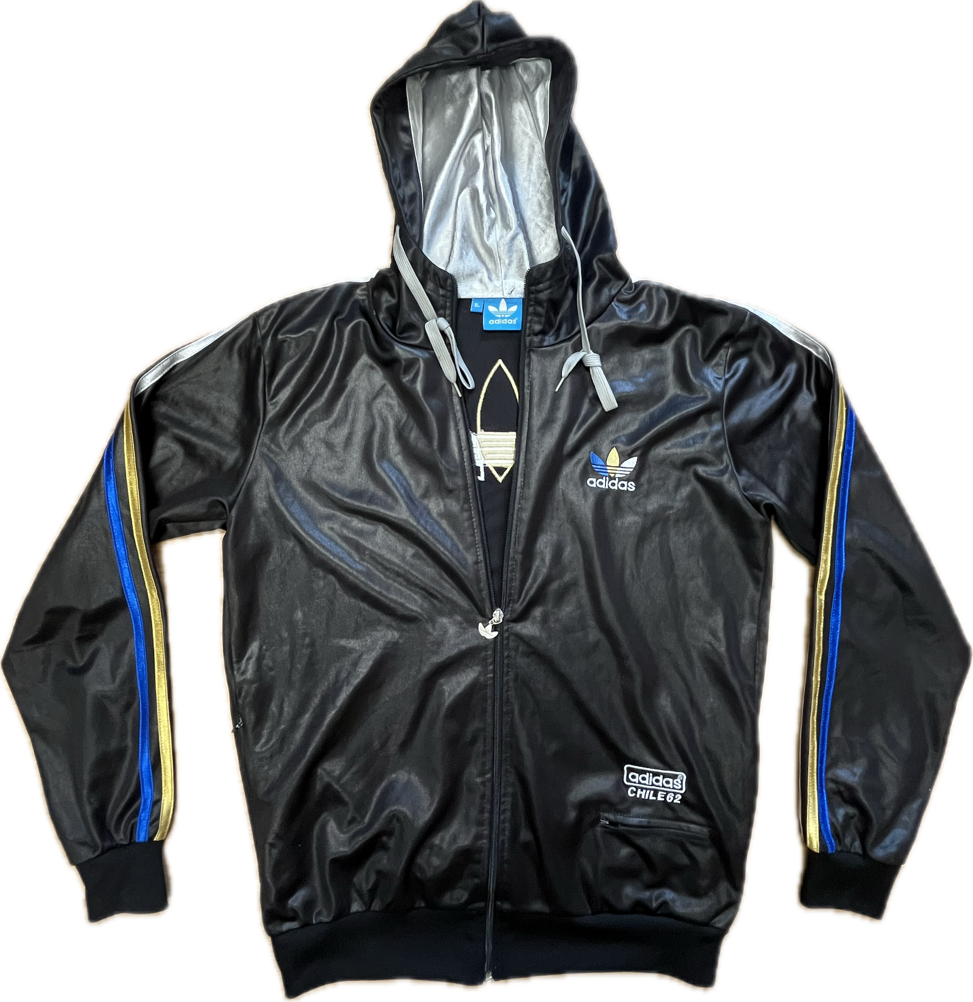 This is an original, black with white details Adidas Chile 62 jacket. The jacket has a hoodie and a small front pocket that can be closed with a zip.