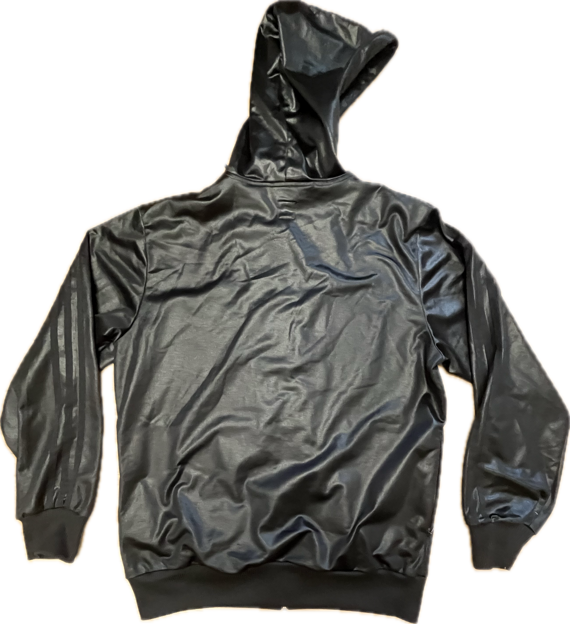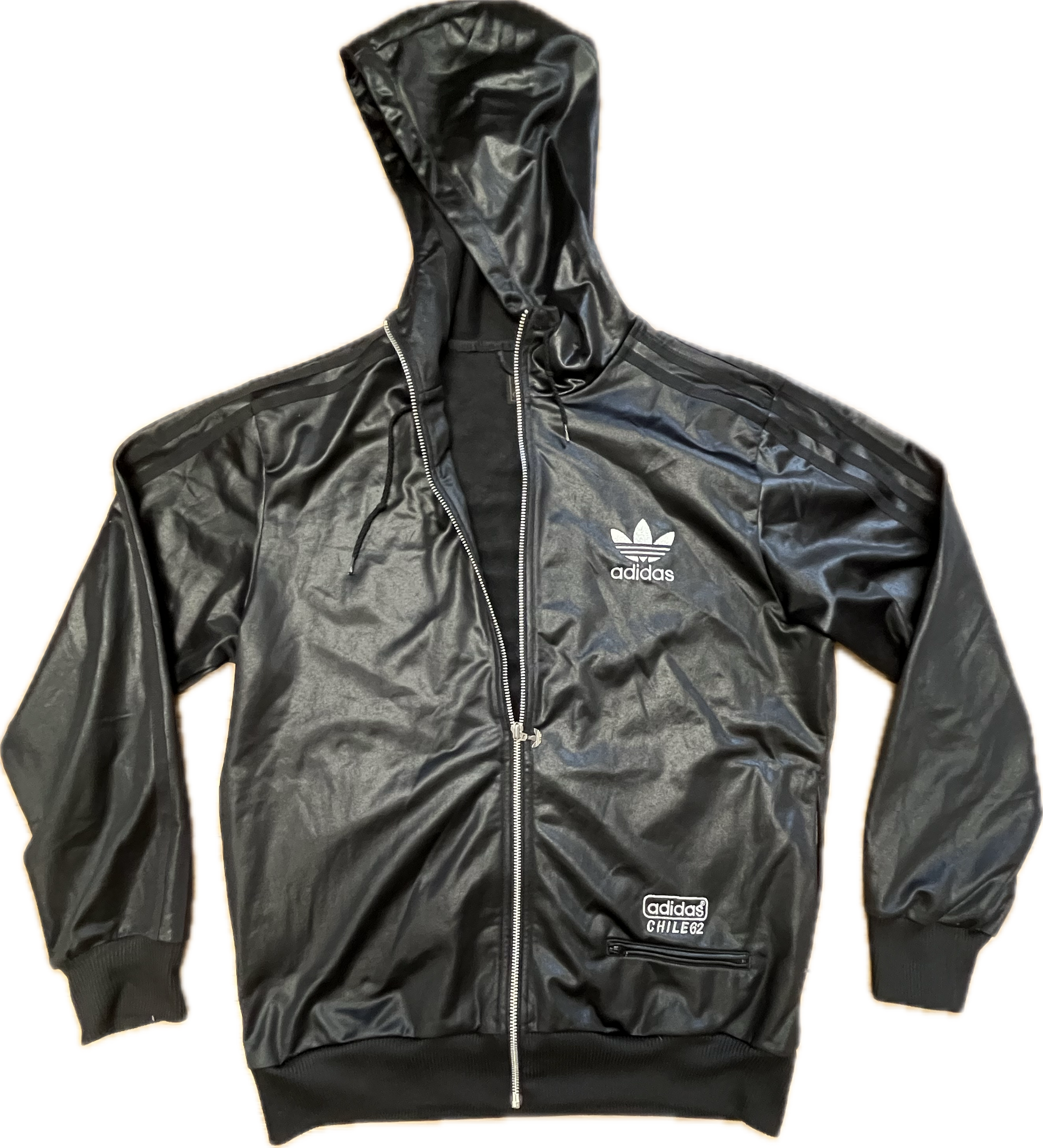 This is an original, black with white details Adidas Chile 62 jacket. The jacket has a hoodie and a small front pocket that can be closed with a zip.