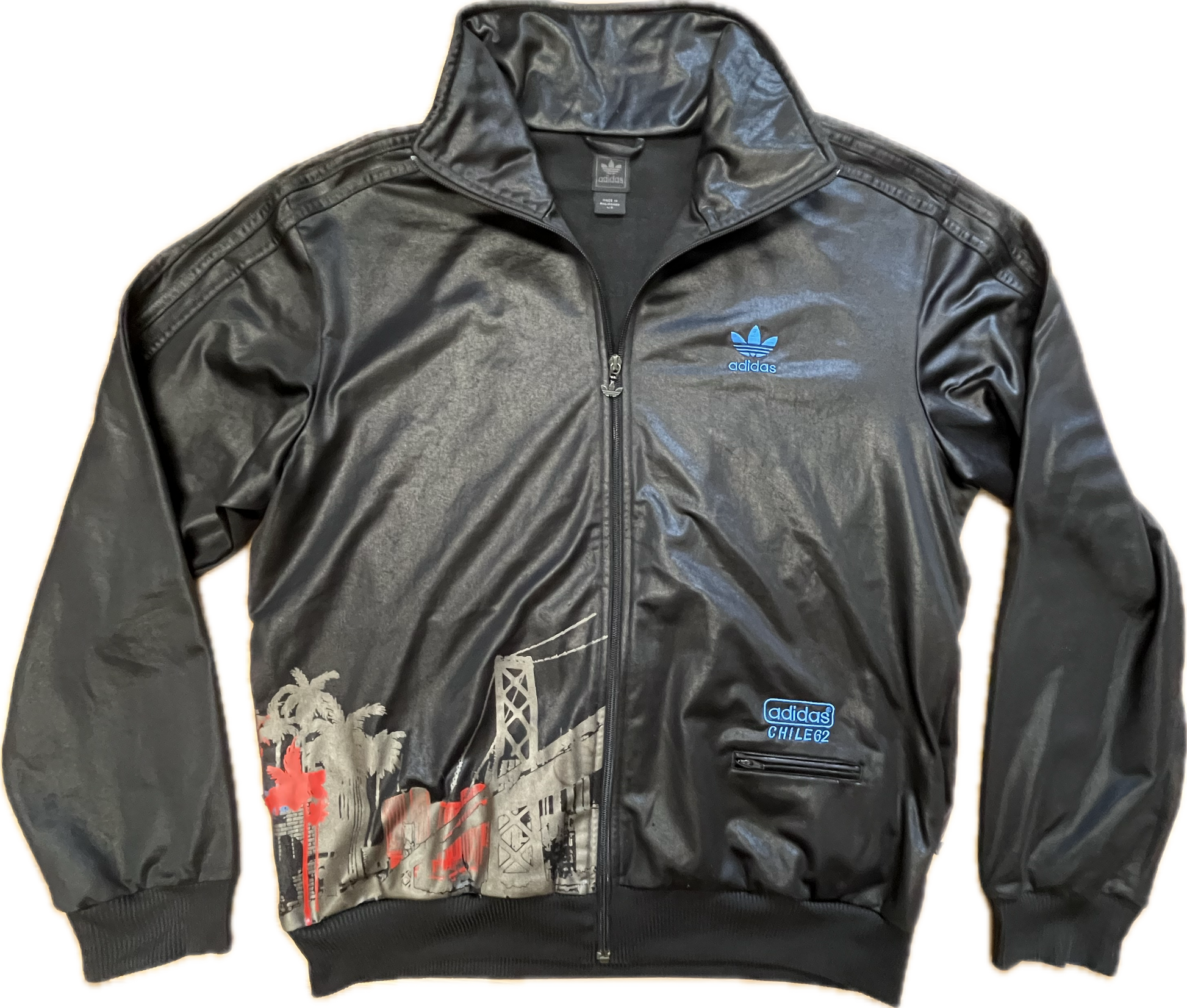 This is an original, black Adidas "Chile 62" jacket with blue logo and front and back drawings.