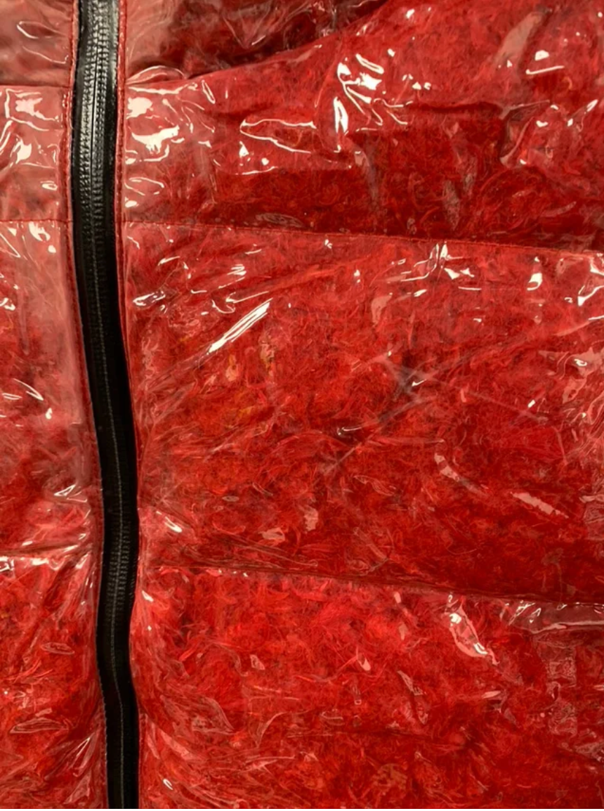 - Colour: Red dyed down feathers inside a transparent shiny material